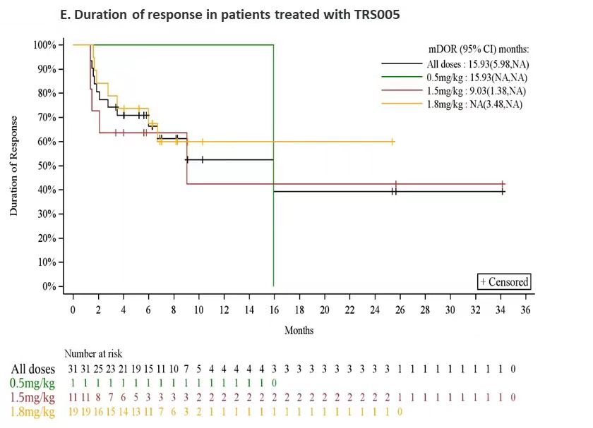在R/R DLBCL患者中,1.8mg/kg劑量組療效信號明顯,ORR、DCR、mPFS分別為59.4%、87.5%和7.26個月。這些結果支撐了TRS005進入單臂II期關鍵臨床試驗階段,有望給R/R DLBCL帶來臨床獲益。