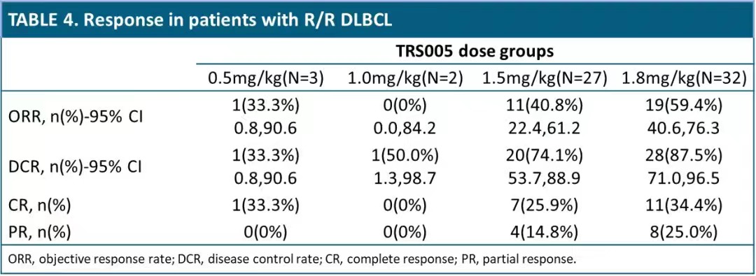 截至2024年3月29日,已有146例CD20陽性的B細胞非霍奇金淋巴瘤患者接受了TRS005單藥治療,其中71名患者為R/R DLBCL,中位治療時間為4個周期。